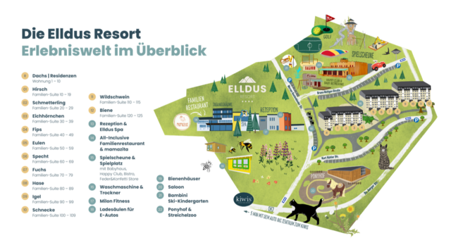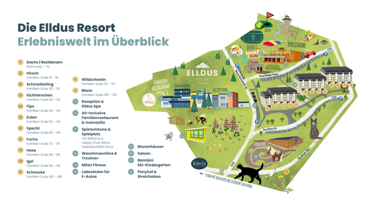 und Familien-Suiten befinden (5 Etagen, kein Fahrstuhl vorhanden, außer bei den Elldus Residenzen | nicht barrierefrei), - dem riesigen Spielscheune-Areal mit Indoor- & Outdoor-Spielplatz, Kunstrasenfußballplatz, kleinem Rodelhang und Ski-Kindergarten, Saloon mit Grill, Happy Club, Keramikwerkstatt und Family-Store direkt hinter den Apartments,