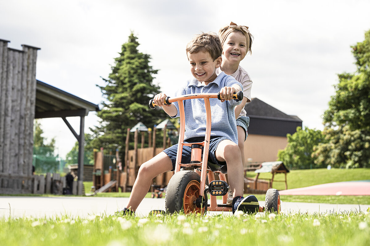 - Outdoor-Spielgelände mit Kletterburg, 9 m hoher Rutschturm, Sandkasten, Riesen-Jumpkissen, Bobbycars, Adventure-Minigolf (18-Loch), Wasserspielplatz, Fußballplatz sowie Kleinkind-Entdeckerbereich